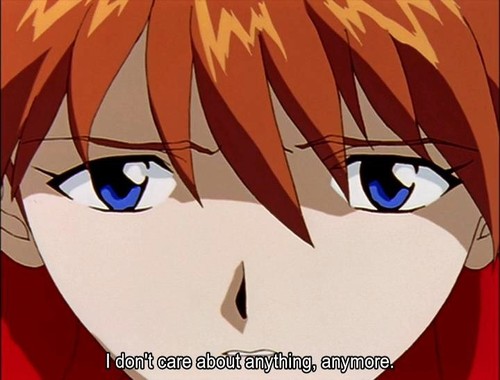 There are times when my sadness feels quiet and empty like Rei, and more times when it’s so like Shinji that I’ve spent years not being able to read a criticism of his character without taking it as a personal insult. But just as often, I’ve hung my identity on one thing – looking correct enough, eating, myself as a student – to the obliteration of all else. I think I avoided copping to being an Asuka not just out of shame at my own emotions, but to distance myself from the commodification of her character as an object of desire. In the always reductive and exhausting discourse about who is the “best girl,” the characteristics that make Asuka wonderful but also so delicate and explosive and sad – her temper, her stubbornness, her recklessness – are flattened into a Badass Girl or a prototypical fiery red-head. Alignment with Asuka meant running into what I already feared: being seen as a woman, as the measure of my attractiveness, before anything else. I’ve watched Evangelion about seven times now, and Asuka’s loss of hope and the way she is failed by so many adults seems more harrowing and awful than ever. When she lies emaciated in a bathtub, broken and resigned after feeling betrayed by her own body and mind, it’s so searing and true to my experience of growing up. She’s so much like me at 14, and I’m still so much like her. When I finished the last episode of my latest re-watch, I cried at Shinji’s cathartic decision that maybe, just maybe, his life could have a greater value. Evangelion is the fictional narrative closest to my heart, and I wouldn’t add or take away any moment of it, but I did find myself fantasizing about Asuka having her own breakthrough. At the very least, I thought maybe I could value the parts of her that are in me more fully.